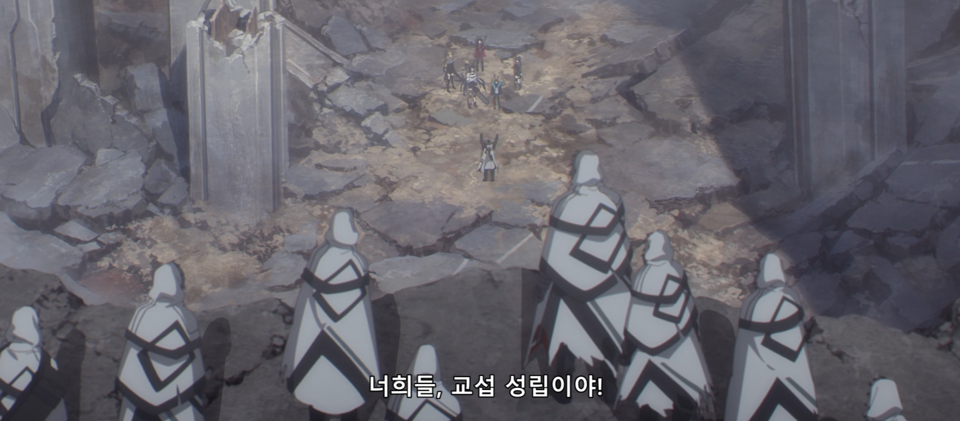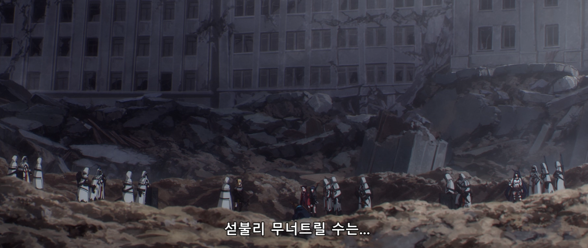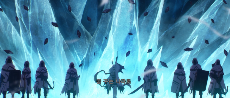 결국 리유니온 잔당의 도주를 위해 프로스트노바가 홀로 로도스 일행과 맞서 싸우며 목숨을 걸고 버티는 장면은 매우 처참하면서도 인상적이었다. 첫 등장 때 압도적이었던 노래 영창은 점점 힘겹게 부르는 모습으로 변했고, 결국 부제목 그대로 ‘서리 속의 죽음’을 맞는 장면은 전투씬과 연출 면에서 1,2기 통틀어 최고 수준이라고 느꼈다.